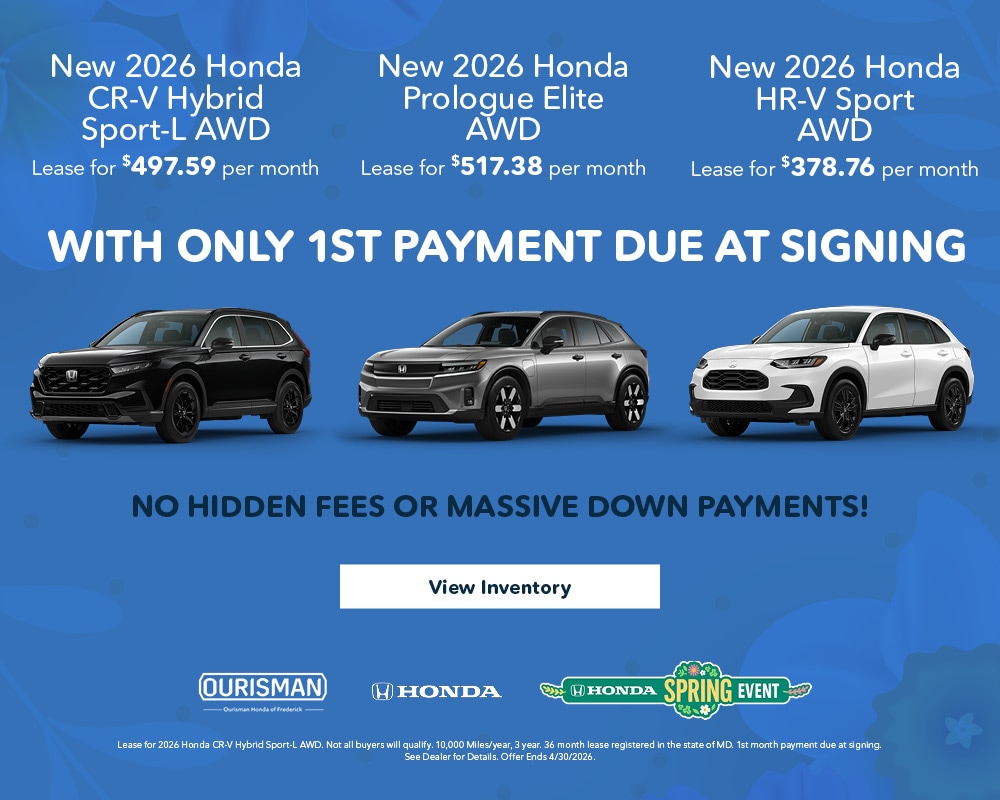 Our dedicated service team is here to assist you during every step of the process. Let us assist you in selecting the right Hondas to suit your needs, and take your top choices out for a test drive on the open road. This is the best way to make the final selection because you will get a real sense of how the vehicle responds to your direction. Whether you're in Germantown, MD or Deerwood, MD, find out how easy it is to get into a new, used, or CPO Honda when you visit our showroom at Ourisman Honda of Frederick in Frederick, MD today.