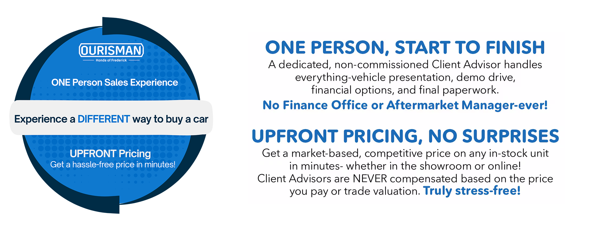 At Ourisman Honda of Frederick, we're rewriting the car-buying script. With us, it's all about simplicity, transparency, and working with one dedicated non-commissioned Client Advisor from start to finish. Say goodbye to the traditional dealership runaround and say hello to the One Person Process.