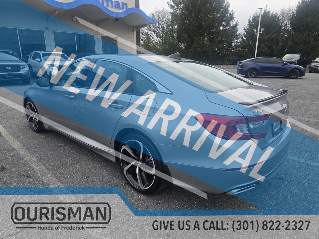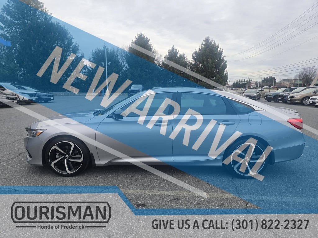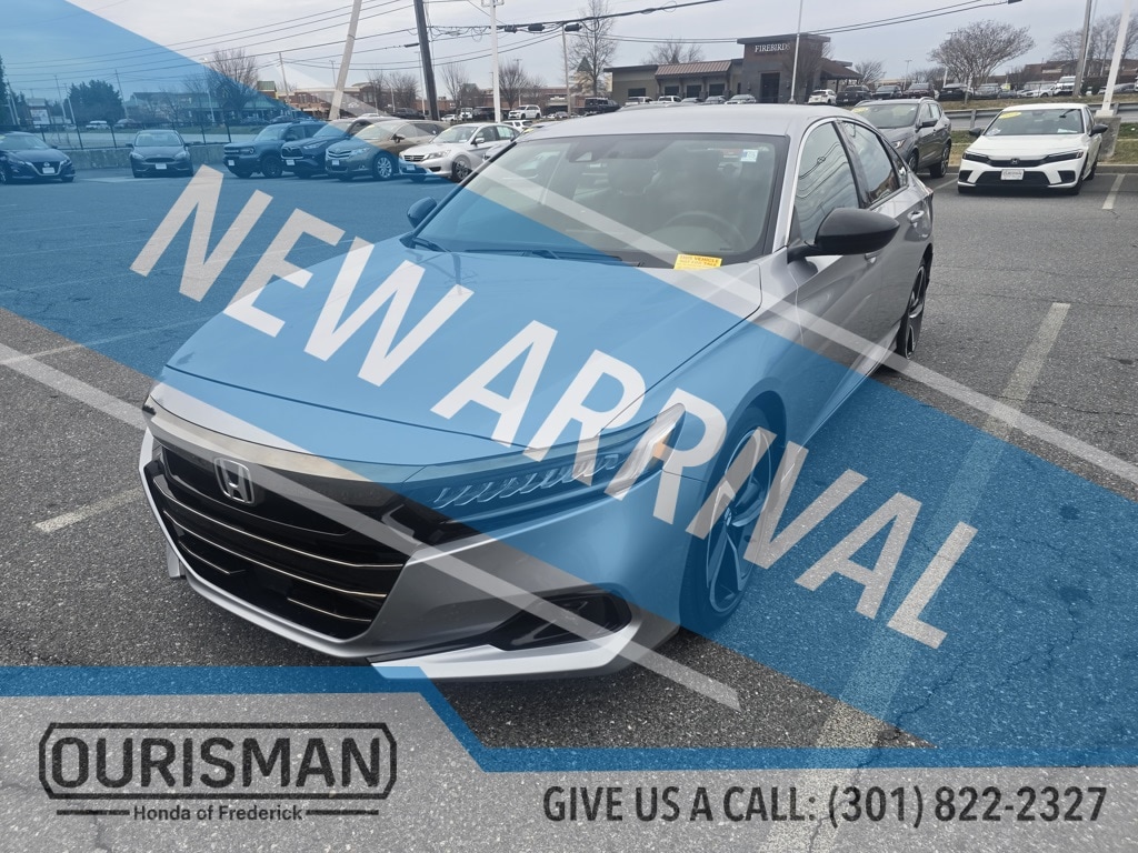 Ourisman Honda of Frederick is pleased to present this 2022 Honda Accord Sport. he 2022 Honda Accord Sport trim offers a compelling blend of athletic styling, engaging performance, and practical features. It is powered by a 1.5-liter turbocharged inline-four engine producing 192 horsepower and 192 lb-ft of torque, paired with a continuously variable transmission (CVT) and front-wheel drive. This setup delivers an EPA-estimated 29 mpg in the city and 35 mpg on the highway. Externally, the Sport trim distinguishes itself with 19-inch alloy wheels, LED headlights and fog lights, a gloss-black decklid spoiler, dark chrome grille, and chrome exhaust finishers . Inside, it features a leather-wrapped steering wheel and shift knob, sport pedals, and a 12-way power-adjustable driver's seat with 4-way power lumbar support. The infotainment system includes an 8-inch touchscreen with Apple CarPlay and Android Auto integration, complemented by an 8-speaker audio system. Rear passengers benefit from dual 2.5-amp USB charging ports. Safety is prioritized with the Honda Sensing suite, encompassing adaptive cruise control, lane keeping assist, and collision mitigation braking. Additional features include a multi-angle rearview camera and a rear seat reminder. With its combination of sporty aesthetics, robust performance, and comprehensive safety features, the 2022 Accord Sport stands out as a well-rounded midsize sedan.