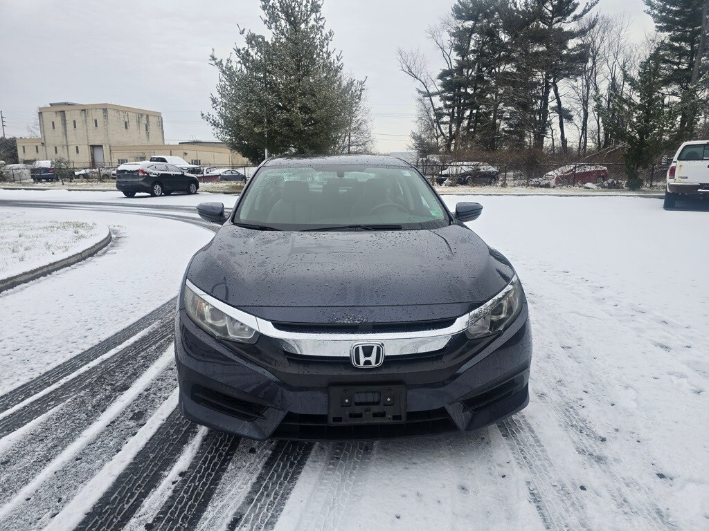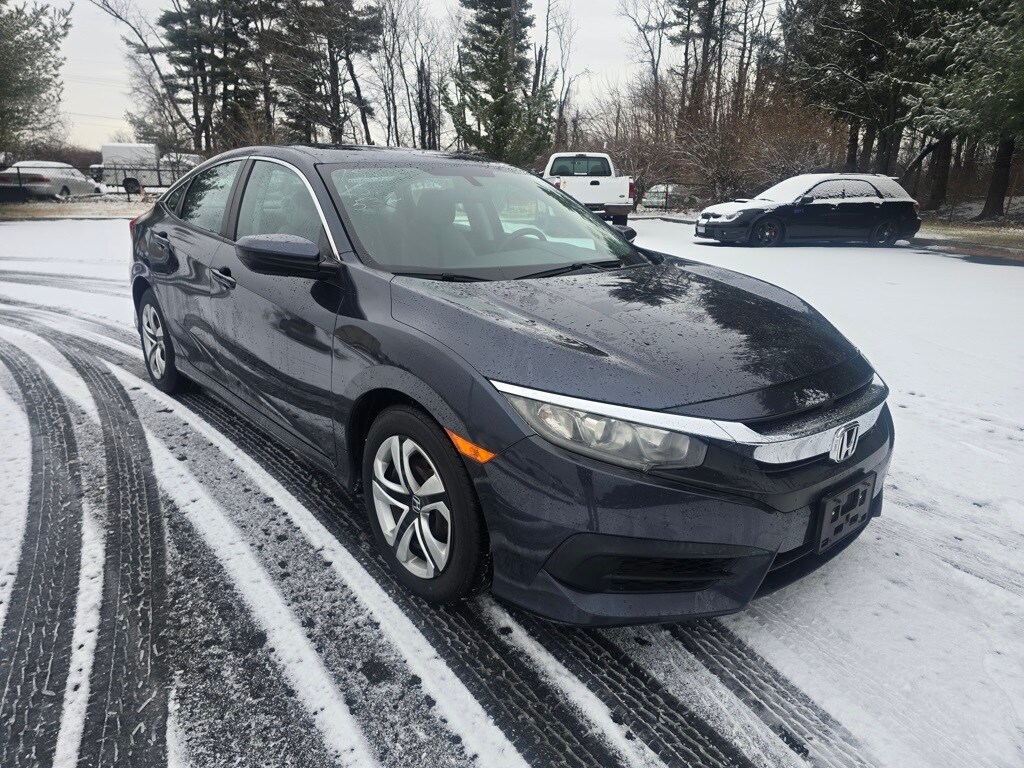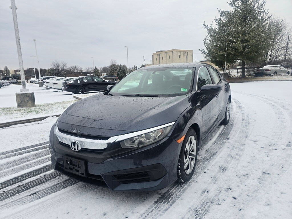 Ourisman Honda of Frederick is pleased to present this 2018 Honda Civic LX. The 2018 Honda Civic LX is the base trim of the Civic lineup, offering a well-rounded combination of efficiency, comfort, and reliability. It comes equipped with a 2.0-liter 4-cylinder engine that produces 158 horsepower, paired with a continuously variable transmission (CVT). The exterior features 16-inch steel wheels with covers, projector-beam halogen headlights with auto-on/off, and LED daytime running lights. Inside, the Civic LX includes a 5-inch central display screen, a rearview camera, Bluetooth HandsFreeLink and streaming audio, and a four-speaker audio system. Comfort and convenience are supported by automatic climate control, power windows and locks, and a tilt-and-telescoping steering wheel. The LX also includes Honda's advanced safety features such as Vehicle Stability Assist with traction control, Anti-lock Braking System, and a tire pressure monitoring system. Although it lacks the more advanced infotainment and driver-assistance features found in higher trims, the 2018 Civic LX offers solid value with its excellent fuel economy, refined ride quality, and practical design.